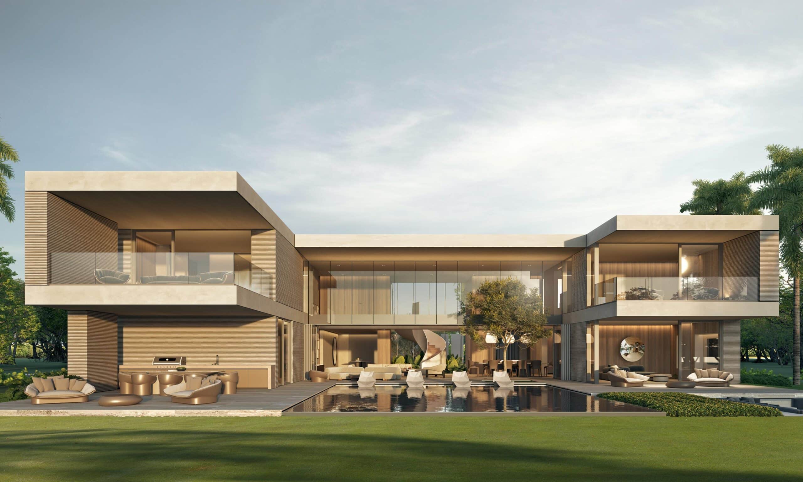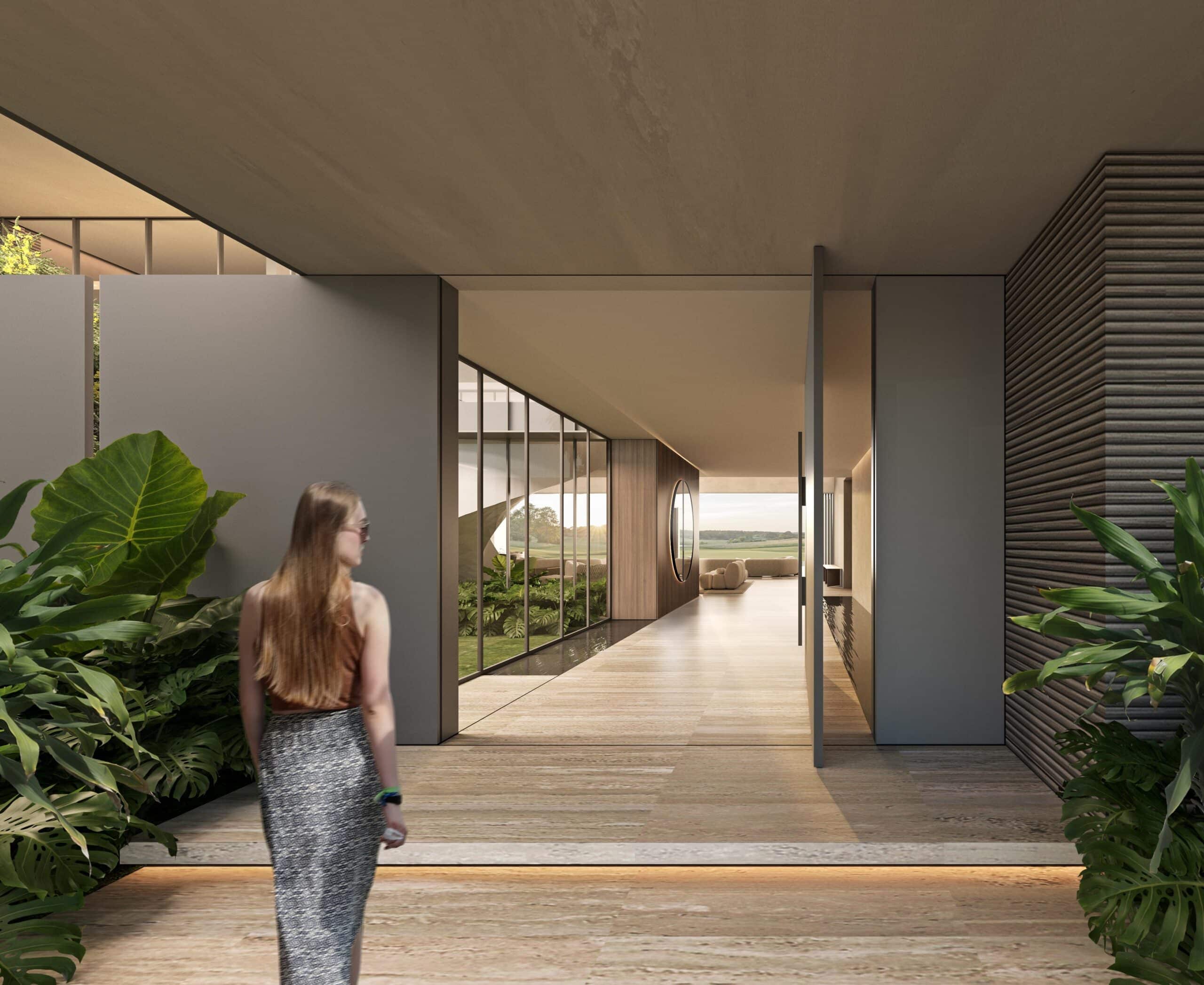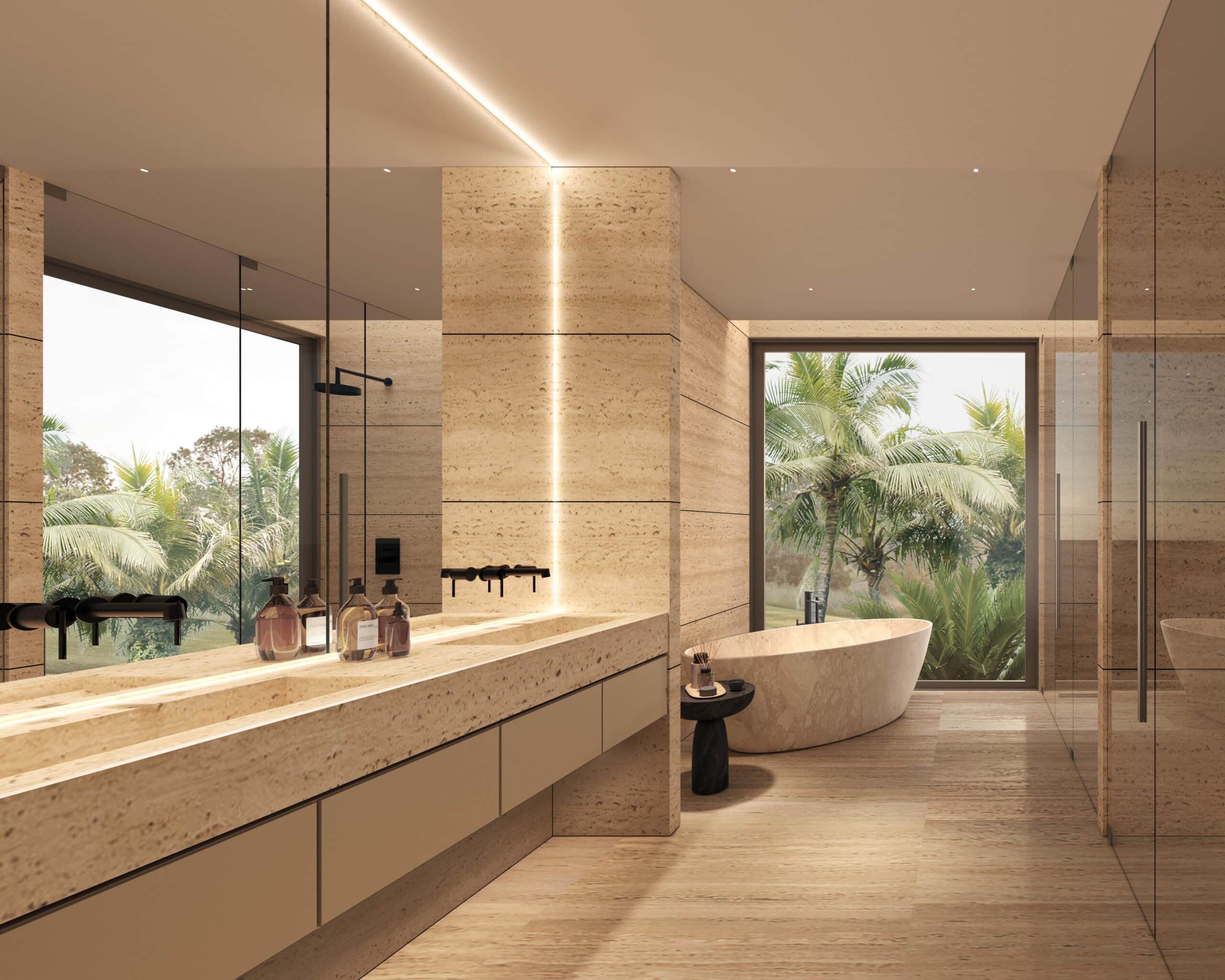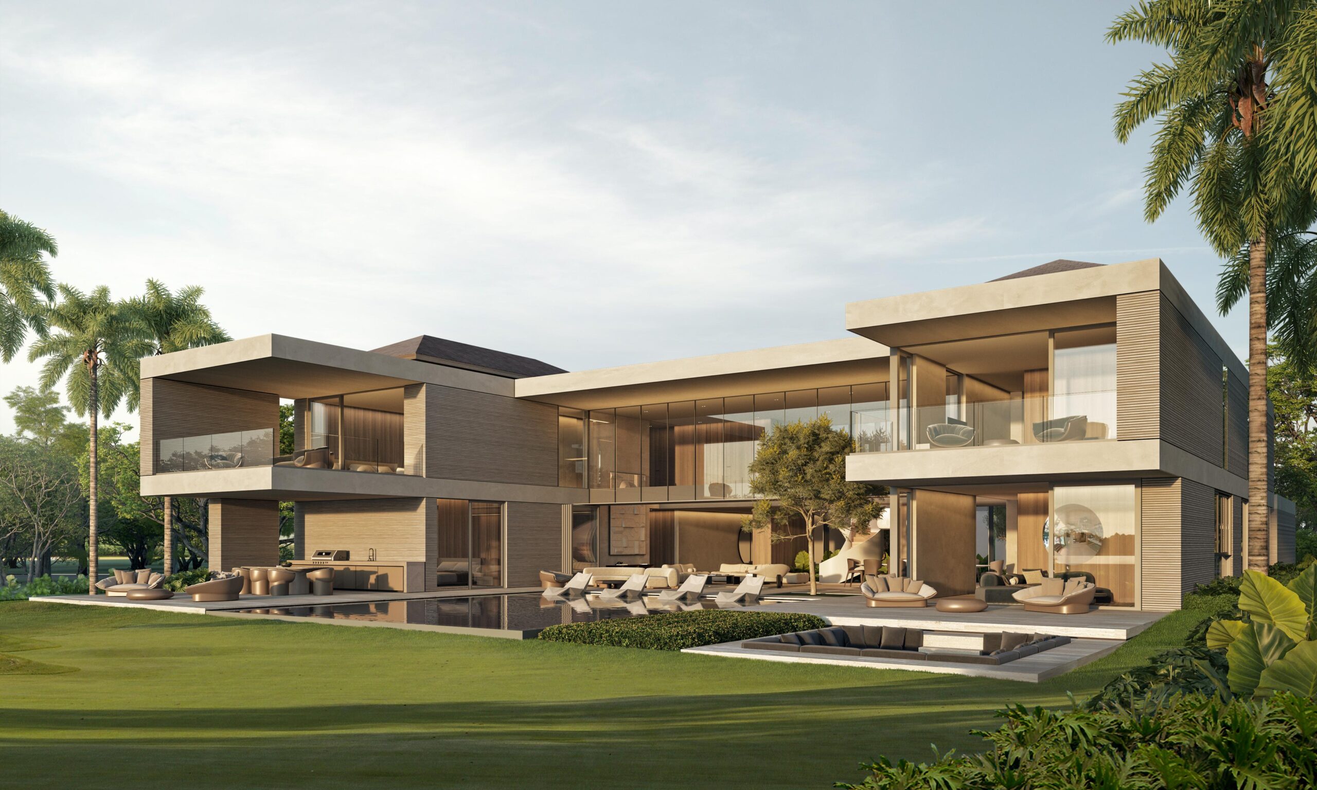Contemporary architecture with clean lines and balanced proportions, blending modern elements with tropical touches. Natural materials such as stone, wood, and neutral finishes dominate, combined with large windows that maximize natural light and the indoor-outdoor connection. Expansive roofs, overhangs, and pergolas add freshness and elegance, harmoniously integrating with the surrounding landscape.