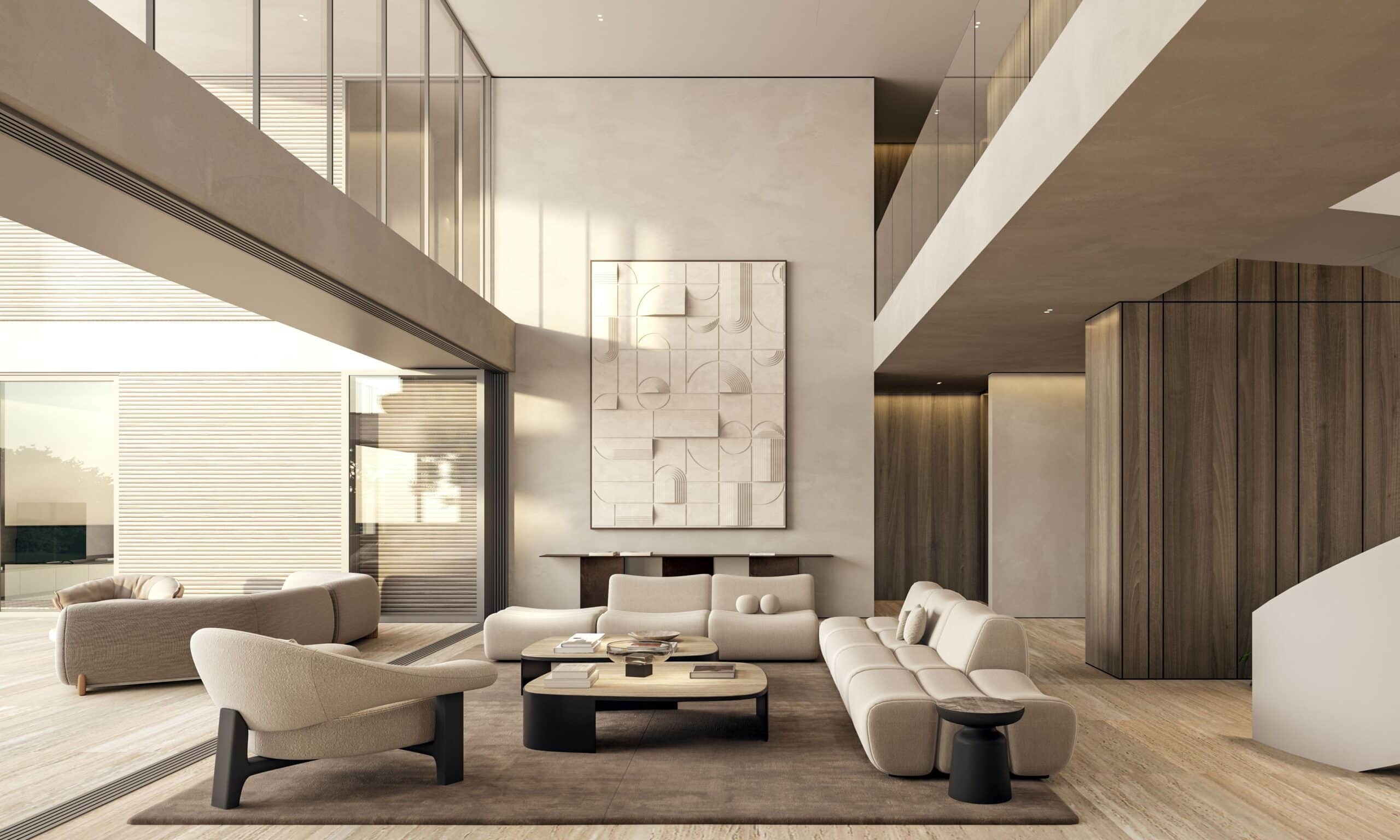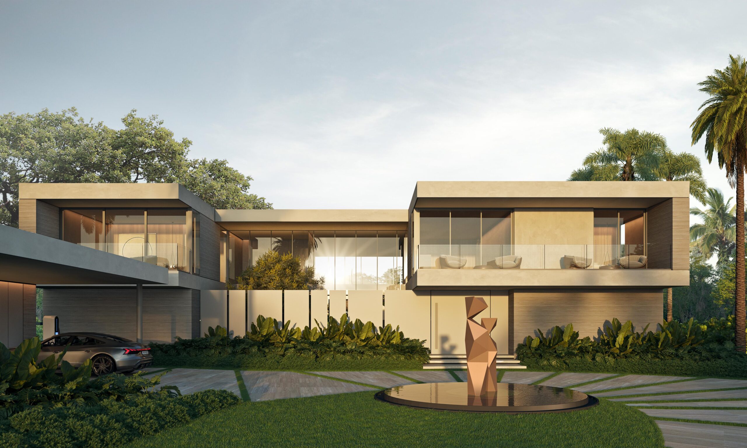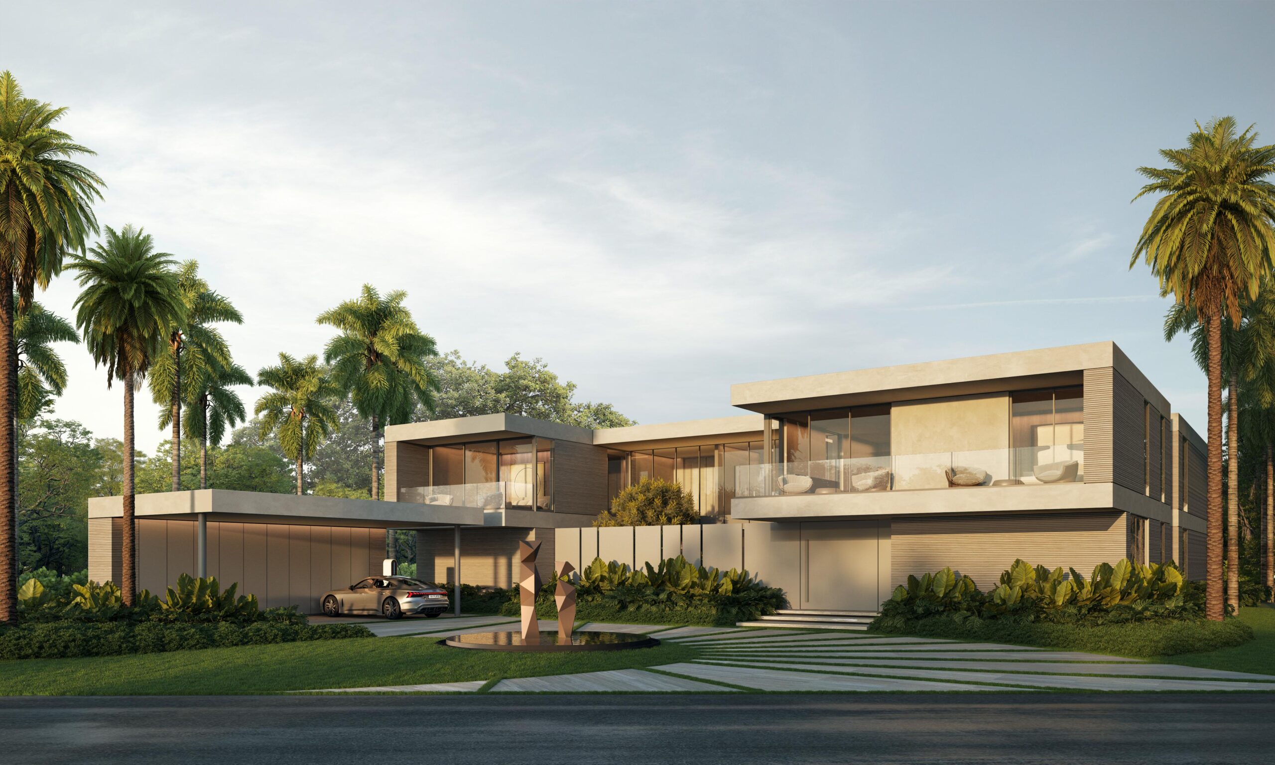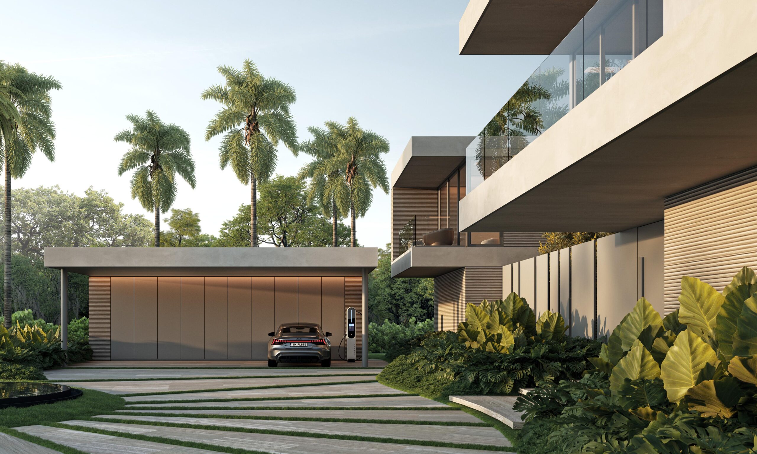 Contemporary architecture with clean lines and balanced proportions, blending modern elements with tropical touches. Natural materials such as stone, wood, and neutral finishes dominate, combined with large windows that maximize natural light and the indoor-outdoor connection. Expansive roofs, overhangs, and pergolas add freshness and elegance, harmoniously integrating with the surrounding landscape.
